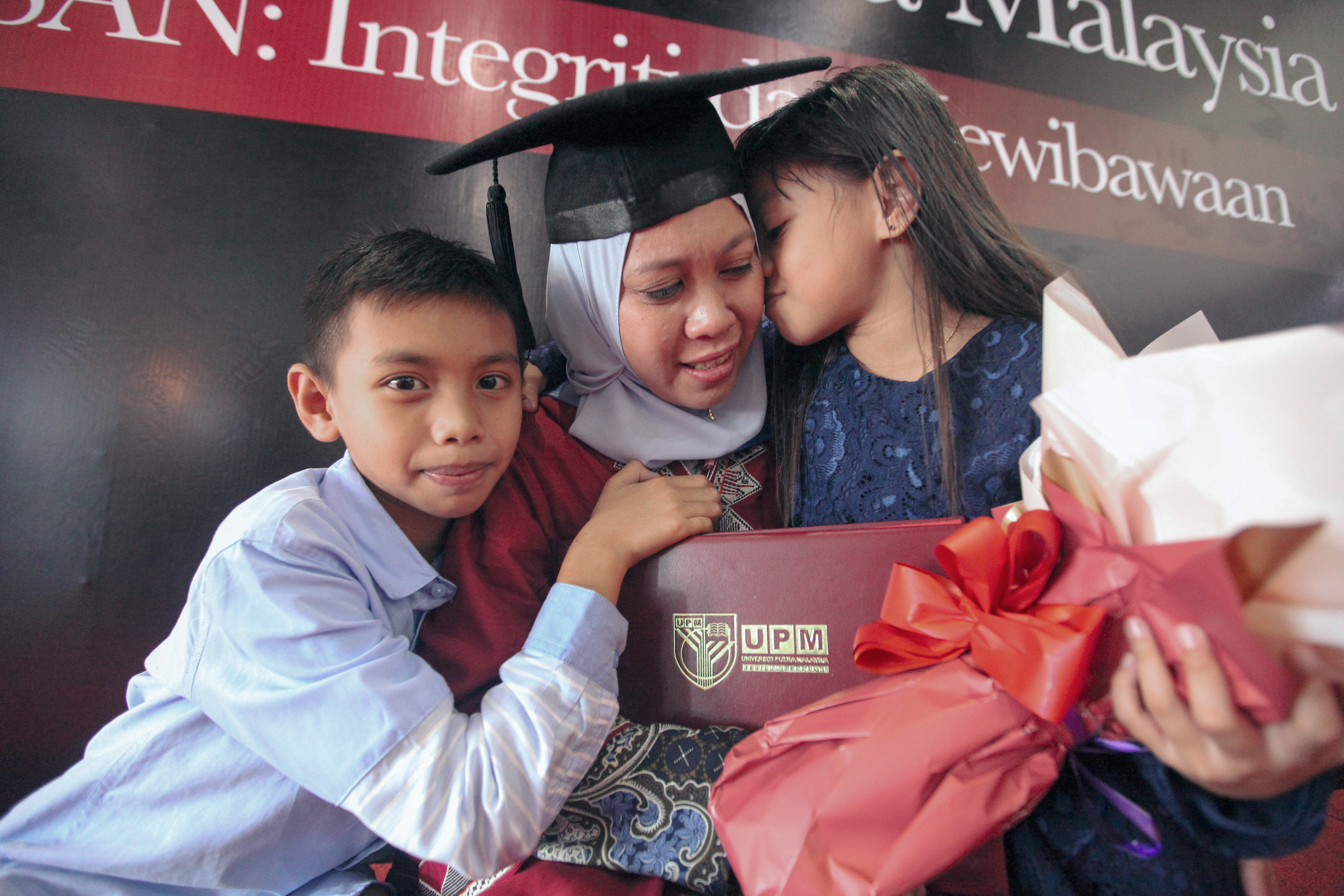 “Pernah beberapa kali anak saya ikut saya ke kuliah dan peperiksaan kerana jarak rumah dari pusat saya belajar jauh dan tiada siapa yang menjaga anak. Semasa peperiksaan semester akhir saya juga terpaksa membawa anak-anak,” katanya. - UPM