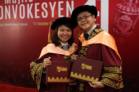 SERDANG, 5 Nov- Pasangan suami isteri Ng Tzu Shan dan Looi Ley Juen hari ini melakar kenangan indah apabila masing-masing menerima Ijazah Doktor Falsafah (PhD), pada Majlis Konvokesyen Universiti Putra Malaysia (UPM) ke-41.