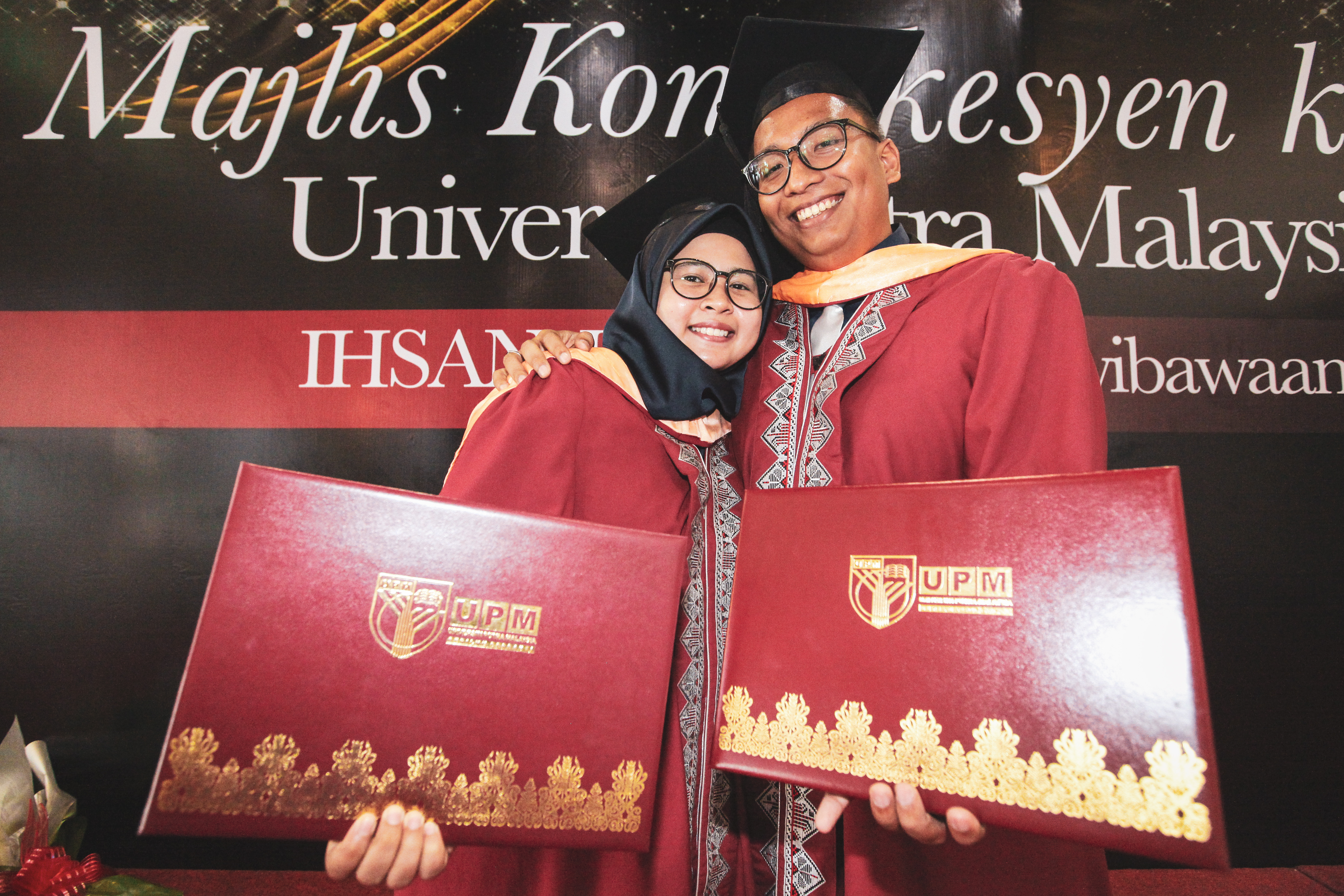SERDANG, 19 Nov – Pasangan suami isteri Redzuan Mohammad Suffian James dan Norwahyuni Mohammad Yusof mencipta kenangan manis apabila berjaya bergraduat bersama-sama dengan memperoleh ijazah Master Biokomposit Teknologi dan Rekabentuk (INTROP) pada Majlis Konvokesyen ke-43 Universiti Putra Malaysia (UPM), hari ini.