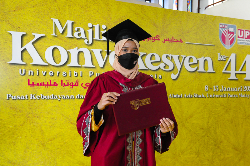 SERDANG, Jan 13 – Being raised by a single mother is no barrier for Qistina Balqis Mohamad Zamri to continue her studies until she has successfully obtained a degree in Bachelor of Science in Park and Recreation at the 44th Universiti Putra Malaysia (UPM) Convocation Ceremony today.