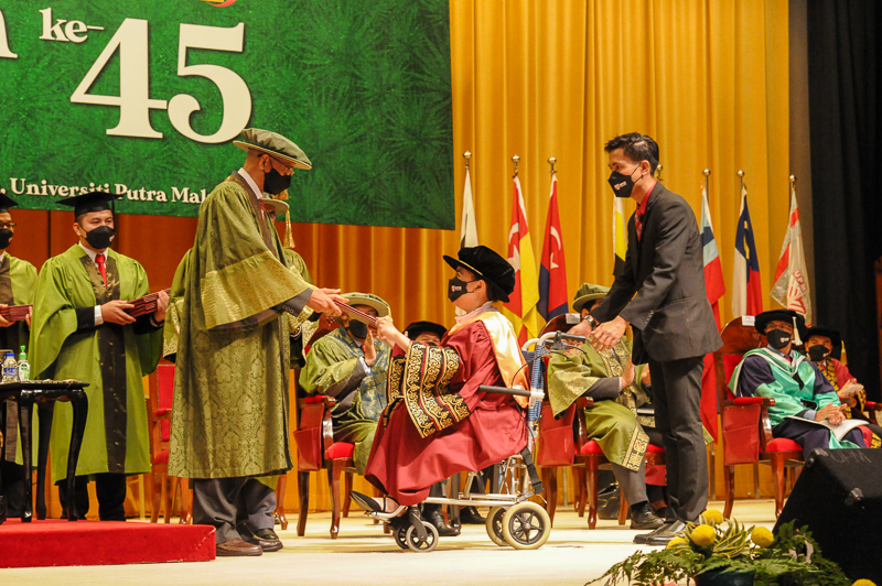 “Saya rasa UPM adalah universiti yang sangat sesuai untuk graduan OKU sebab banyak fasiliti khas yang memudahkan pelajar OKU di sini. Sebagai seorang OKU cacat fizikal saya tidak perlu jauh untuk berjalan kerana tempat letak kereta khas disediakan berhadapan dengan setiap bangunan.