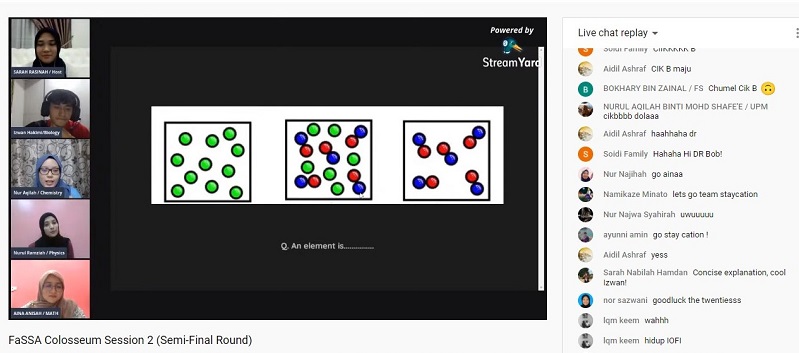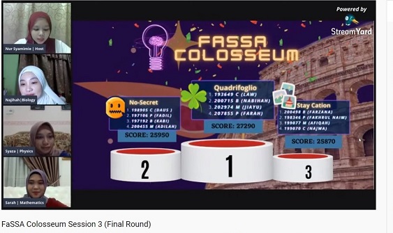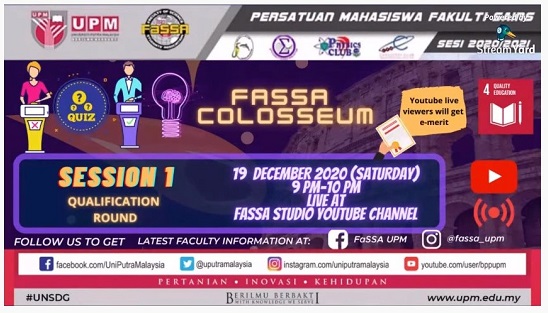 SERDANG – In overcoming the COVID-19 challenges and making efforts to stay in touch with students, the Faculty of Science Students’ Association (FaSSA), Universiti Putra Malaysia (UPM), has successfully conducted the FaSSA Colosseum online through the Quizizz platform and streamed it live on YouTube.
