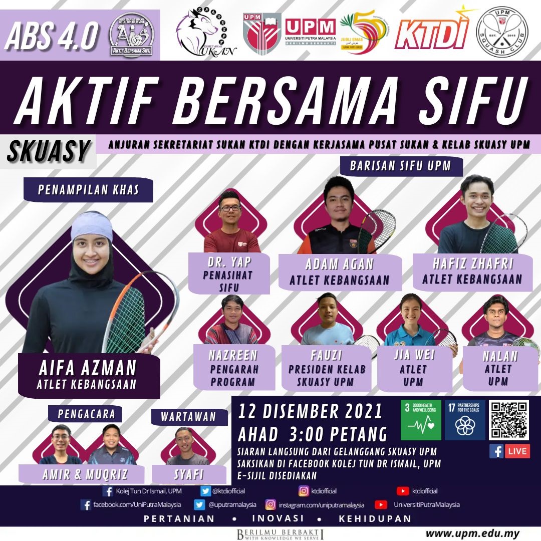 SERDANG, Dec 12 - The Sports Secretariat of the College Representative Council, Kolej Tun Dr Ismail (KTDI), Universiti Putra Malaysia (UPM), in collaboration with UPM Sports Centre and Squash Club, has held the fourth series of the Aktif Bersama Sifu (ABS) (Active with Sifu) programme, which was conducted in hybrid mode at the UPM squash court and broadcasted live on the KTDI’s Facebook Page.