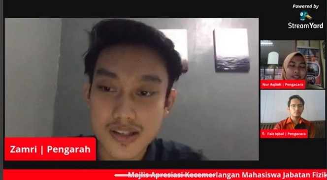Majlis apresiasi yang lazimnya dijalankan secara fizikal itu, dilaksanakan secara atas talian di laman Facebook “Kelab Mahasiswa Fizik (KMF) UPM” menggunakan Streamyard sebagai platform bersiaran secara langsung.