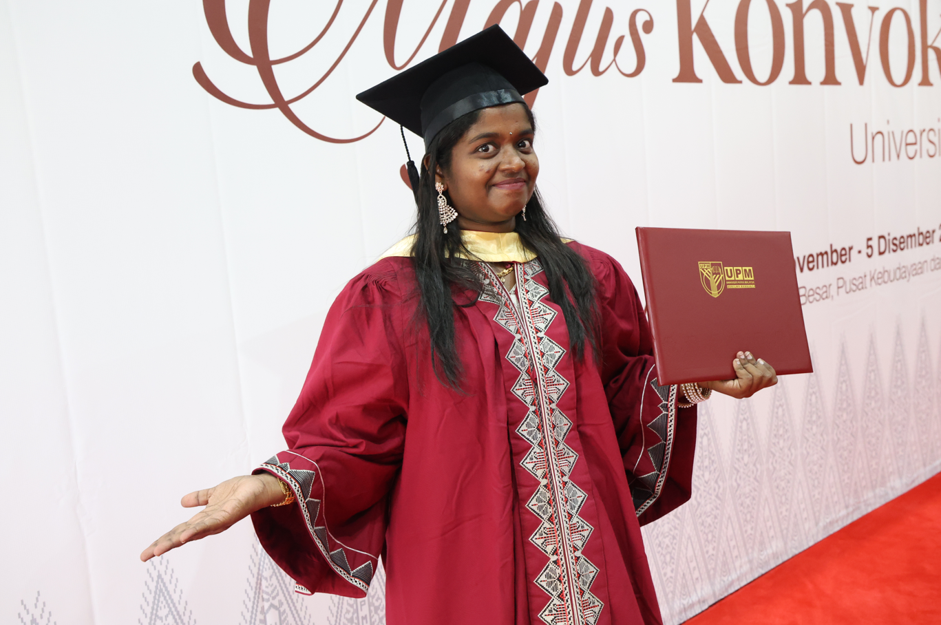 SERDANG, 5 Disember - Menjadi anak pertama dalam keluarga yang menjejakkan kaki ke menara gading, kejayaan Malini Ravi Chandran, 27, bukan sekadar miliknya, tetapi simbol harapan seluruh keluarga pada Majlis Konvokesyen UPM Ke-49 hari ini.
