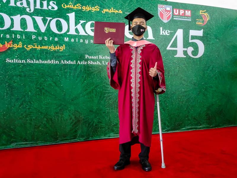 Oleh kerana belum mempunyai kaki palsu, saya jarang ke sekolah kerana tiada alat sokongan. Saya hanya ke sekolah pada tingkatan 5 untuk mengambil SPM,” katanya ditemui selepas tamat Majlis Konvokesyen UPM ke-45 hari ini.