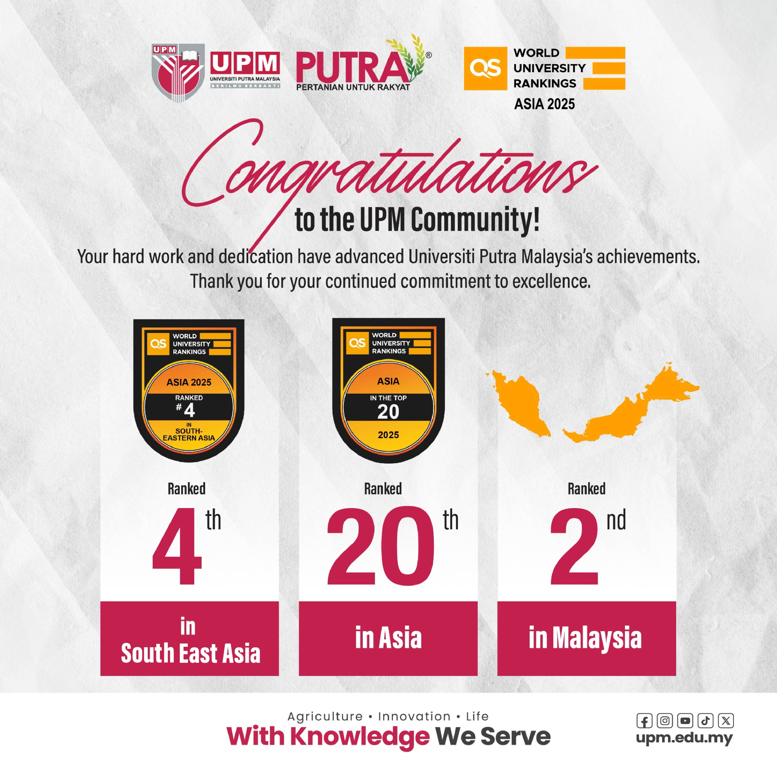 SERDANG, 6 November 2024 - Universiti Putra Malaysia (UPM) has advanced in the 2025 QS World University Rankings: Asia, now securing the 20th position, a five-spot rise from last year's 25th place.