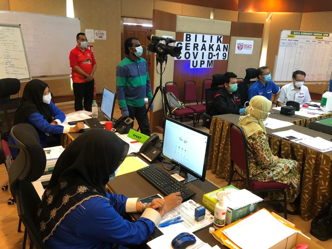 At UPM, all activities and issues related to COVID-19 are coordinated in the UPM COVID-19 Operations Room located at the OSH Hall, Occupational Safety and Health Management Office (PPKKP), UPM. The activities in the operations room are led by Director of Occupational Safety and Health Management Office, Assoc. Prof. Dr. Mohd Rafee Baharudin. All coordination of information, issues, and problems arising from all UPM entities are implemented quickly and effectively in this COVID-19 Operations Room.