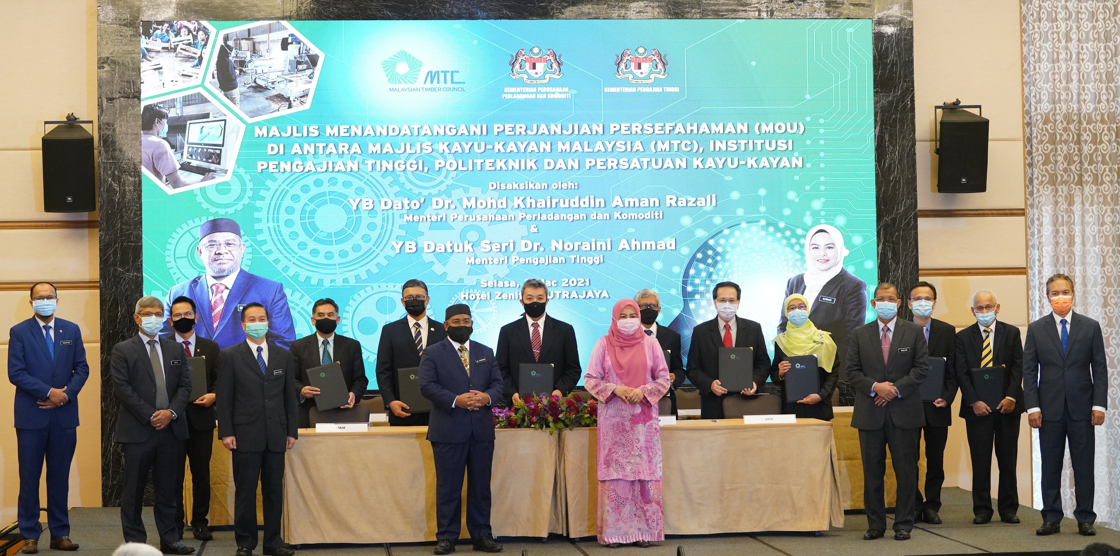 The MoU inking ceremony between the Malaysian Timber Council (MTC), Timber Associations, HEIs and Polytechnics was witnessed by the Minister of Higher Education, Datuk Seri Dr. Noraini Ahmad, and the Minister of Plantation Industries and Commodities, Dato’ Dr. Mohd Khairuddin Aman Razali.