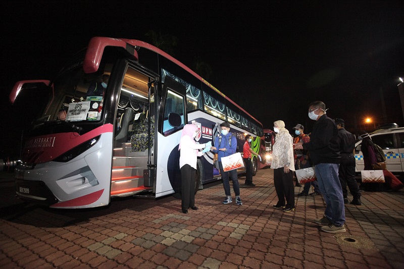 SERDANG, 5 Mei 2020 - Universiti Putra Malaysia (UPM) berkerjasama dengan enam universiti awam zon tengah bagi proses perjalanan pulang pelajar-pelajar tujuh buah universiti awam di Selangor, Kuala Lumpur dan Putrajaya ke beberapa lokasi selatan di Negeri Sembilan, Melaka dan Johor melibat seramai 240 pelajar bermula pukul 10 malam ini.