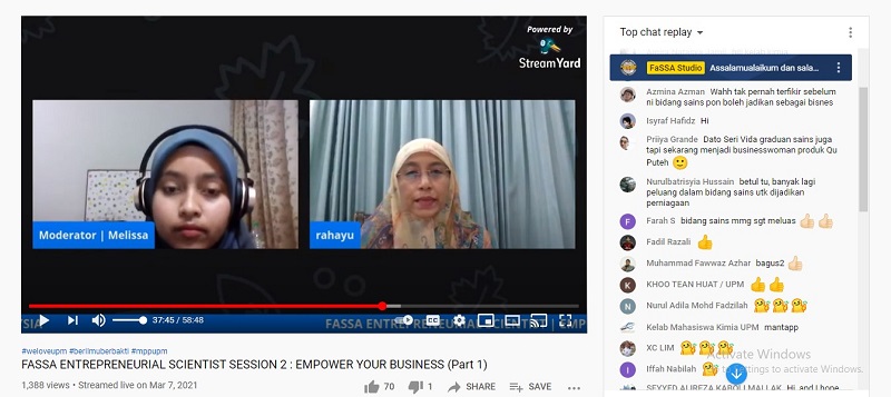 Programme adviser, Dr. Mohd Noor Hisham Mohd Nadzir, was very excited because the programme received encouraging responses from the live broadcast audience, which reached about 2,600 total views on FaSSA YouTube Studio. The programme may be continued in the coming semester.