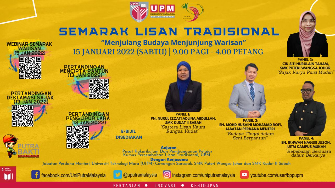 The programme from the Traditional Oral Performance (QKB2109) course was organised by the Co-curriculum and Student Development Centre, Universiti Putra Malaysia (UPM), in collaboration with the Prime Minister's Department, Universiti Teknologi Mara (UiTM), Sarawak Branch, SMK Puteri Wangsa, Johore, and SMK Kudat II, Sabah.