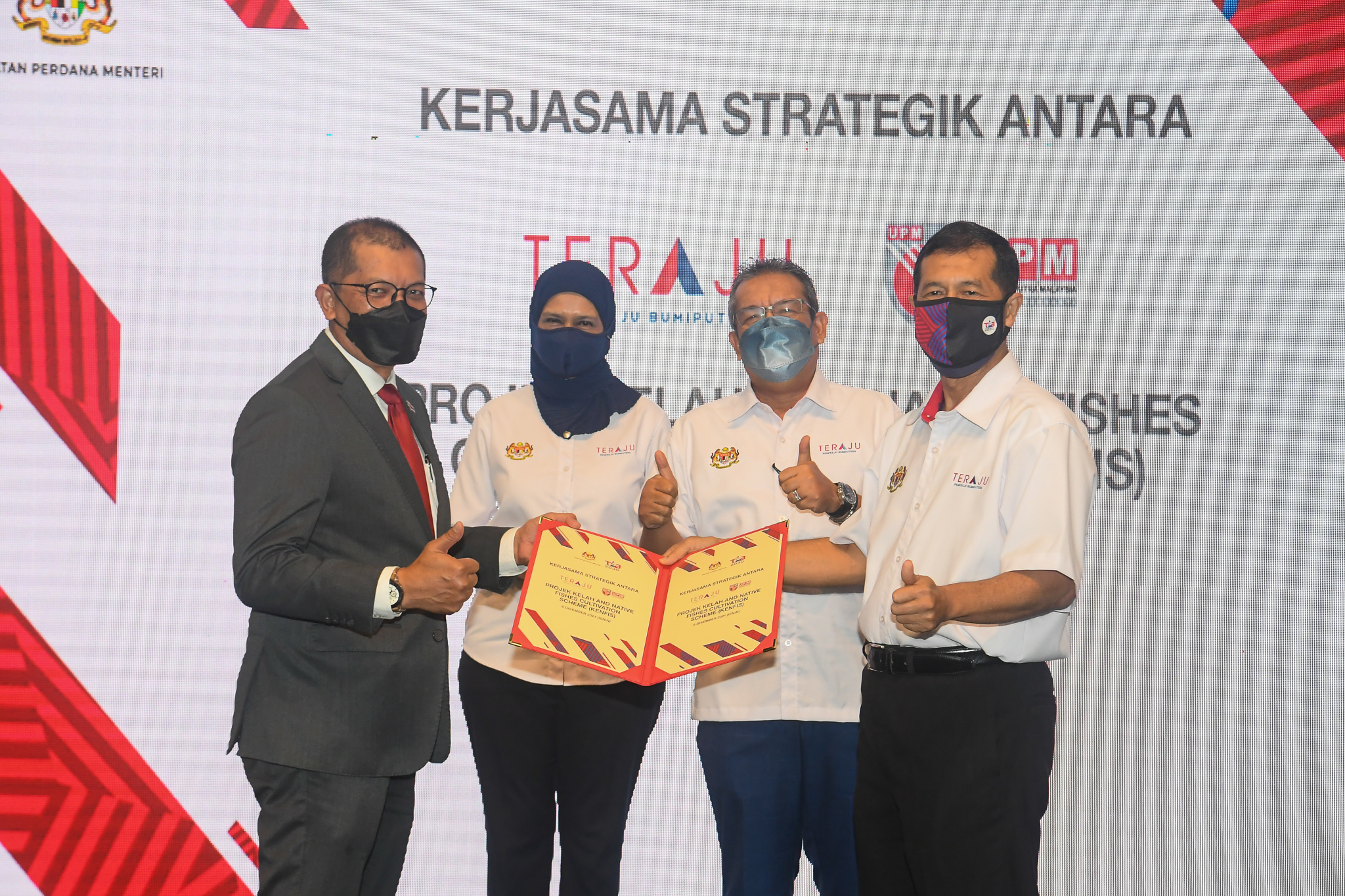 The Memorandum of Understanding (MoU) was handed over by TERAJU's chief executive officer, Md. Silmi Abd Rahman, to UPM vice-chancellor, Prof. Dr. Mohd Roslan Sulaiman, witnessed by the Minister of Entrepreneur Development and Cooperative, Tan Sri Noh Omar, and the Deputy Minister from the Prime Minister's Department (Special Duties), Datuk Mastura Mohd Yazid.
